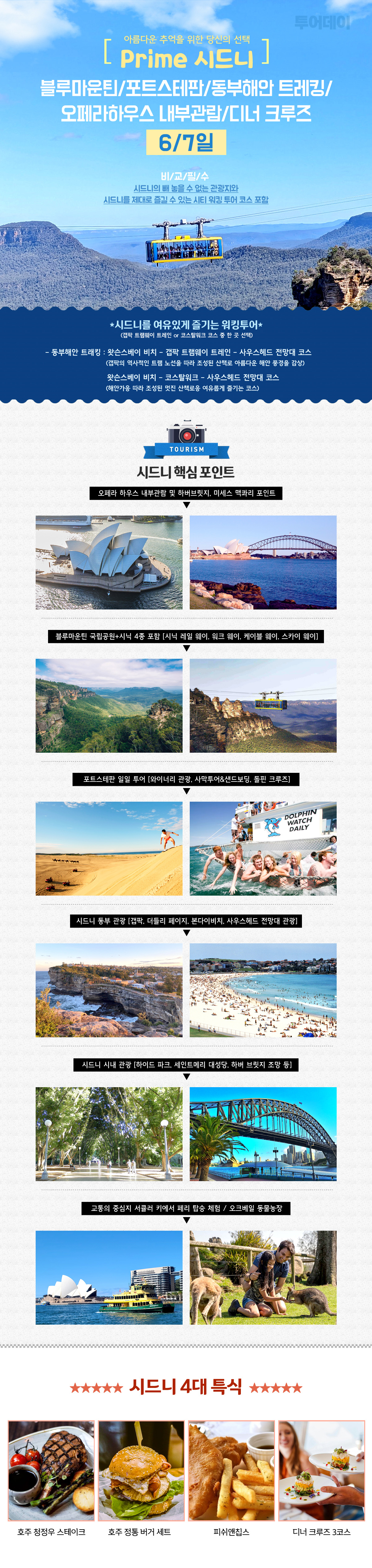 ✨전일정 4성급 특급호텔 ✨📸비/교/필/수 시드니의 빼 놓을 수 없는 관광지와 시드니를 제대로 즐길 수 있는 시티 워킹 투어 코스 포함 - 동부해안, 달링하버 코스 + 서큘러 키 코스 ✨ 교통의 중심지 서큘러 키에서 페리 탑승 체험(샤크아일랜드 와프/클리프톤 와크 경유- 왓슨스 베이 와프 하차) 👍4대 특식 " 호주 청정우 스테이크, 호주 정통 버거 세트, 피쉬앤칩스, 디너 크루즈 3코스" 👍블루마운틴 국립공원+시닉 4종 포함 [시닉 레일 웨이, 워크 웨이, 케이블 웨이, 스카이 웨이] 👍포트스테판 일일 투어 [와이너리 관광,사막투어&샌드보딩, 돌핀 크루즈] 👍오페라 하우스 내부관람 및 하버브릿지, 미세스 맥콰리 포인트 👍시드니 동부 관광 [갭팍, 더들리 페이지, 본다이비치, 사우스헤드 전망대 관광] 👍시드니 시내 관광 [하이드 파크, 세인트메리 대성당] 👍아름다운 해안 도시 울릉공 관광 👍하버 브릿지와 달링 하버까지 멋진 뷰를 감상할 수 있는 바랑가루 산책